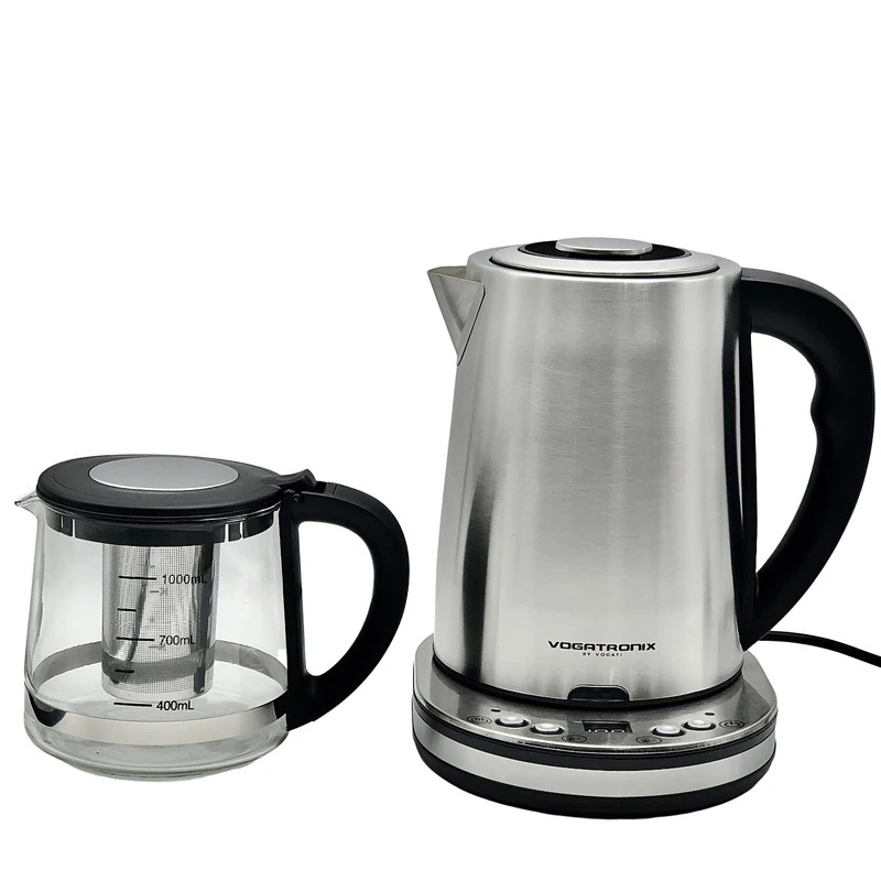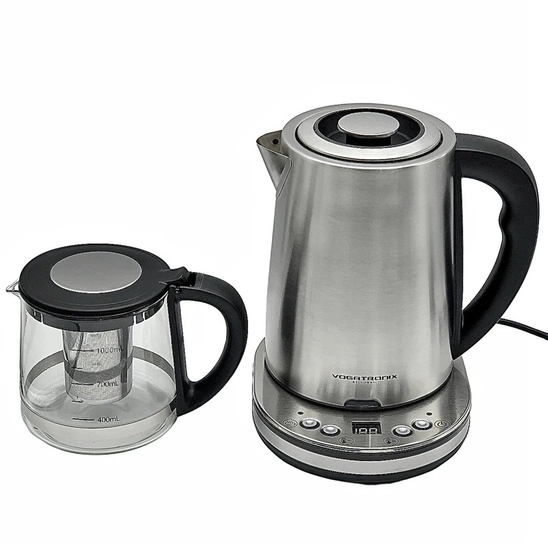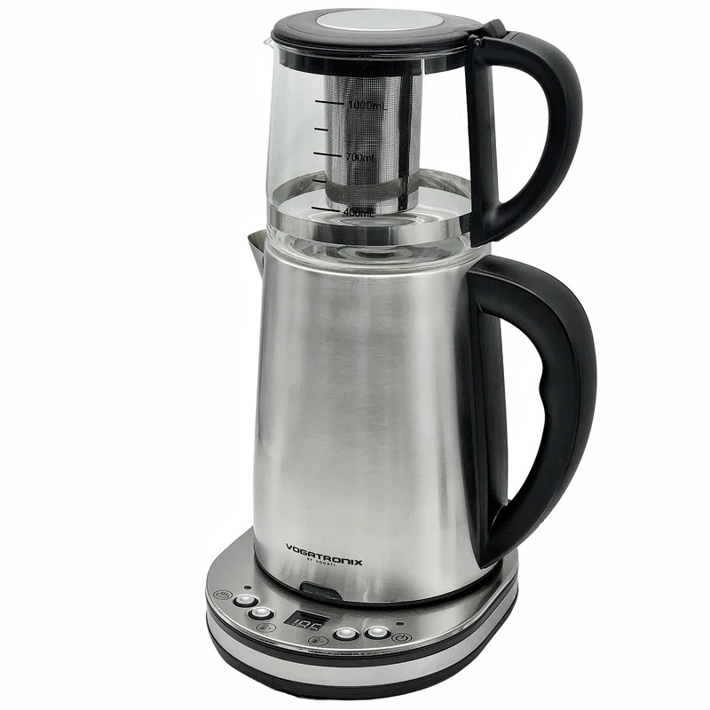 VOGATRONIX(VOGATI) TEA MAKER VE-199 چای ساز وگاترونیکس( وگاتی) دارای بدنه استیل ضد زنگ و با کیفیت است شامل یک کتری 1.8 لیتر و قوری شیشه ای1.0 لیتری است که هرکدام در جداگانه دارند و برخلاف بسیاری از مدلها با یک در ارائه نمیشوند. قوری همراه به فیلتر ضد جرم نیز مجهز شده که براحتی قابل شست و شو است.
