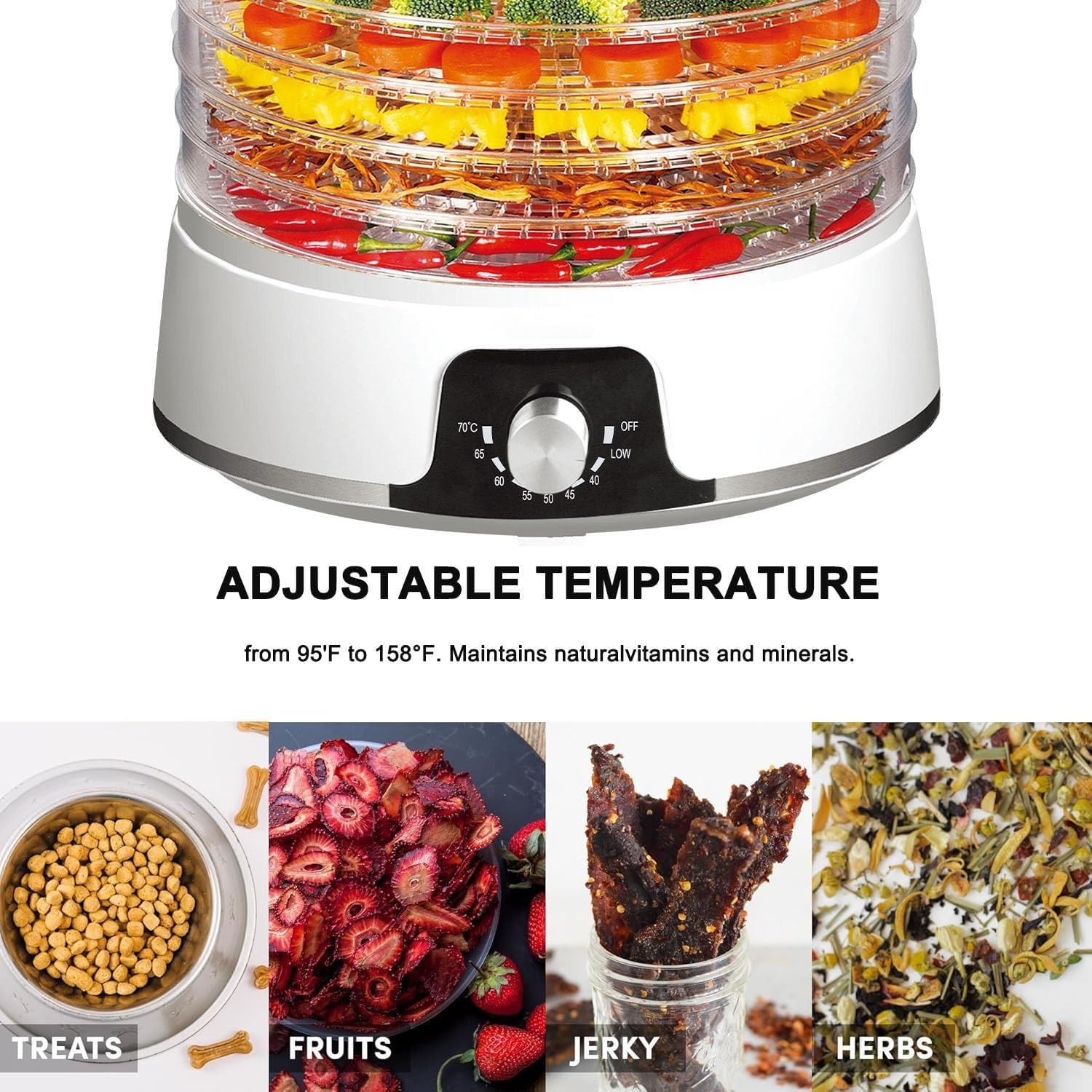 ۵ طبقه سینی خشک کن مجزا: این دستگاه دارای ۵ طبقه سینی خشک کن پلاستیکی است که به شما امکان میدهد حجم زیادی از مواد غذایی را به صورت همزمان خشک کنید.